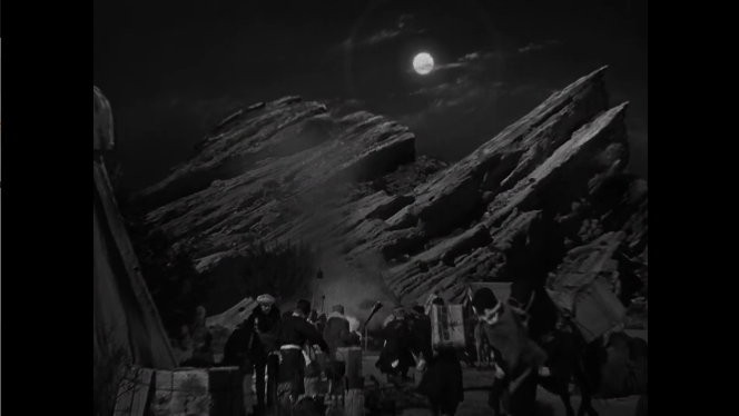 One problem I have with the film is similar to one of my major issues with Dracula: I find the setting of Tibet (actually Vasquez Rocks Natural Area Park once again) in the opening to be far more interesting and atmospheric than the main one of London. Though we're only here for less than ten minutes as opposed to the entirety of the first act, this place is so much more exotic and memorable, especially with the setting being a moonlit night. Moreover, like Borgo Pass, the valley where Glendon and Renwick search for the mariphasa is said to be an evil place the natives are frightened of, as they refuse to guide the scientists there. Specifically, it's rumored to be filled with demons, and both men have strange experiences while making their way through it. Renwick, at one point, claims that something is holding his legs and, shortly afterward, Glendon flies back against a stone wall, saying that something struck him (the way he mimes trying to power through whatever this invisible force is comes off as overdone andsilly). The first werewolf's presence is felt during this sequence, as he's heard howling in the distance, and when Glendon finds the mariphasa, the way they film the werewolf as he stalks him is very effective. The shots of his shadow appearing on the wall behind Glendon and peering at him over the rocks are creepy, and the scuffle between the two of them is done well enough to cover up any problems with the makeup. If there are any downsides to this opening, it's the dated cultural sensibilities that are front and center here. The