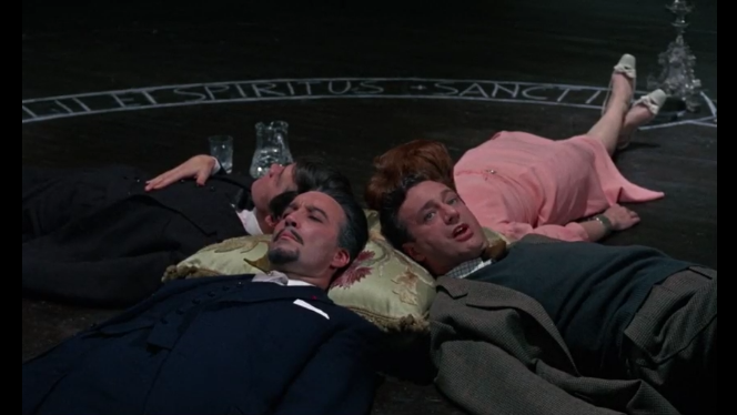 While that depiction of Satan is maybe a bit too traditional and stereotypical for today's audiences, and as we'll see, the demonic manifestations that occur throughout the film aren't done that convincingly or effectively, what The Devil Rides Out does do successfully is present satanists in a very realistic manner. Like those in Rosemary's Baby, released the same year, they're initially depicted as ordinary-looking people, respectable members of high society in how they're dressed in tuxedos and are having an upscale soiree when you first meet them at Simon's house (only the character of the Countess d'Urfe, with her noticeably crossed eyes, looks somewhat odd). Gradually, their true, sinister nature is unveiled, first by the discovery that de Richleau makes in Simon's observatory and then by the first demonstrations of Mocata's power, but even after that, when you see them getting together at their hideout before driving off into the woods for Simon and Tanith's baptism, they look like normal people out for a nice afternoon drive, dressed as though they're heading for another get together or a club meeting. It's only when you see them in their robes, with Mocata, whom original author Dennis Wheatley is said to have based on Aleister Crowley, leading them in worship of the devil and sacrificing a goat as part of the ceremony, that they've finally shed their veneer.While he wasn't exactly devout, Terence Fisher is said to have been a very religious person nevertheless, and one who was deeply convinced of the eternal triumph of good over evil. This belief is clear in many of his films, especially in his three Dracula films, with their many moments of holy images combating evil and the constant defeat of Dracula, and with how Baron Frankenstein is often resoundingly defeated at the end of those films, but here, he was able to go with it in the purest form possible. Things are very cut and dry here: those who have faith and believe in the power of God over Satan, like the Duc de Richleau, are protected against evil, while those who are faithless and skeptical, like Rex Van Ryn and Richard Eaton, are more likely to fall prey to it. It's never more blatant than the ending, where the spirit of Tanith, who has accepted Jesus Christ in death, has Peggy recite the incantation that completely obliterates the cultists and creates a large, glowing cross in the back of their ceremony room. And at the end of the movie, when time has been reversed in the protagonists' favor and Mocata's life has been taken by the Angel of Death, de Richleau blatantly states that they must give thanks to God.Terence Fisher and cinematographer Arthur Grant truly brought their A-game to The Devil Rides Out, as it is one of Hammer's best-looking movies period. It has that high-class, glossy, mid-to-late 60's color film look to it, with a rather rich palette (as you can see, the purple shrouds that Mocata and some of the other satanists wear really pop off the screen) that lets you know you're watching a top of the line movie (you would never suspect that it actually had a fairly low budget of 285,000 pounds). As usual, Fisher and Grant are able to create a nice feeling of