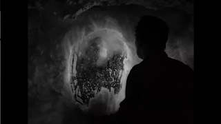 As much of a lackluster Frankenstein movie as it may be, whenever we're dealing with just the Wolf Man, the movie is top notch. Not only is that opening wonderfully spooky but so is the build-up to the first onscreen transformation and kill. Following the opening, the constable in Cardiff comes across Larry lying on the sidewalk. At first, he tries to make him get up and move on, but when he gets no response, he turns him over and shines his flashlight on him, illuminating a bloody wound on his left temple. The constable blows his whistle and Larry is taken to Queen's Hospital. But then, the following night, the full moon rises and he transforms into the Wolf Man. The very constable who found Larry is making his rounds again and is about to go into the police station, when he sees the Wolf Man prowling around nearby. He hides within a doorway, jumps up onto some stacked up sacks, and jumps behind some crates. The constable goes to investigate, only to find no sign of him. But then, when he turns his back, the Wolf Man grabs him from behind, snarling ferociously, and as he struggles, bites into his neck, before dragging his body away. The next morning, when he's found back in his hospital bed, Larry, knowing what happened, tells Dr. Mannering to call the police, saying he killed someone the night before. Mannering has the nurse call Inspector Owen, and when he arrives, Larry tries to tell them that he's a werewolf. But when they won't believe him, and with Owen questioning his identity, Larry grows frustrated and tries to escape, but Mannering signals for some orderlies who restrain Larry and put him in a straight-jacket.After Larry escapes the hospital, he reunites with Maleva and the two of them journey to Vasaria. But after they're told that Ludwig Frankenstein is dead, they travel on, only for the full moon to appear in the sky above them. Feeling himself beginning to change, and then seeing the moon, Larry jumps off the wagon and runs away from Maleva. He hides behind a tree, where he completely becomes the Wolf Man, and despite Maleva yelling for him not to go, runs off into the woods. Later, with the moon in the sky above Vasaria, and him howling in the distance, a procession of people walk down the middle of the village, led by Vazec, carrying the body of a girl in his arms. (I believe this girl is meant to be a barmaid who exchanged looks with Larry when he and Maleva were at the inn; I've also read she was meant to be Vazec's daughter, although it's not made clear in the movie). At first, they fear it could be the work of Frankenstein's monster, but then, they hear the Wolf Man howl nearby and head into the woods to find him. Up near the ruins of CastleFrankenstein, the Wolf Man spots the mob and, snarling at them, turns and runs farther up the hills. They spot him when he's on a ridge and one of the villagers shoots at him with his rifle (like the hunters at the end of The Wolf Man, they don't seem fazed that the "wolf" they're hunting is humanoid and wearing clothing). Though he's hit and tumbles to the ground, the ordinary bullet doesn't hurt him. He quickly gets up and runs to the castle ruins, the mob not far behind him. They lose his trail, as he backs through a doorway and falls through the burnt out flooring. He lands in the snowy cavern beneath the castle and, getting back up and seeing where he fell, makes his way through the cavern and tries to climb up at the other end. Unable to get up, he falls back down and, like when he was caught in the trap in the first movie, falls to the ground and rolls around in a fit. Meanwhile, Maleva is found by the police and taken back to town.Some time later, Larry awakens in the cavern, back to his normal self. Getting to his feet and looking around, trying to get his bearings, he notices a large alcove with a sheet of ice in back of it. Noting something strange about it, he walks up to it and wipes away the snow, revealing a vague, humanoid shape behind it. He grabs a large rock and begins knocking away the ice and snow, revealing the shape to be that of Frankenstein's monster. At first, the Monster remains inert, but when Larry grabs at the ice and rips away more of it, his eyes slowly