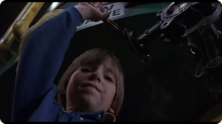 On a technical level, Child's Play 2 is a very well-made film, with its larger budget of $13 million being quite apparent. Both John Lafia and his cinematographer, Stefan Czapsky (who went on to shoot several of Tim Burton's films), establish a very different visual aesthetic from the first film. Unlike the original's muted, dreary wintertime look and feel, this film seems to take place in the springtime (although it was shot in the fall of 1989), and has a brighter and much more colorful look, with a number of the sets and environments having a lot more to their design and paint schemes than you would think. The drawback, though, is that it doesn't feel as creepy, and while some of the nighttime scenes, both interior and exterior, are shot well, others are a tad too bright for their own good. Fittingly, though, since it's a Universal film, the first scenes of Chucky in action take place on a dark and stormy night, with lots of flashing lightning setting a nice mood for his evil deeds. Lafia's enthusiasm for the project, as well as his meticulous preparation and direction, result in a lot of camerawork and shots that are far above average for a money about a killer doll. The movie even opens up with one, starting on a very tight close-up of the undamaged eye in Chucky's burnt head and slowly pulling back while also slightly tilting to reveal it completely. When Andy is being driven home by Phil and Joanne, they almost hit a Play Pals cargo truck that crosses in front of them, and after they stop, there's a shot of the company's artwork, complete with the image of a Good Guy, drawn on the truck's side reflected in the van's window, as Andy looks and sees it. We do also get some more of those Chucky POV shots, like when he first makes his way to the house and reaches for the door handle, and when he closes in on the technician during the climax in the factory, but there's a moment that subverts it, where we see a POV of someone looking for a weapon in the kitchen, but it turns out to be Andy. Lafia also shows off a penchant for long tracking shots, like one that starts on the hallway outside Andy's bedroom, slowly pans back across the wall and down to the bottom of the stairs, where Chucky stands upon first entering the house. There's another one that takes place the following night, which slowly pans over from Andy asleep in bed and goes in on Chucky, as he drops the inanimate toy act and smiles evilly at him. And when Kyle realizes that Andy was telling the truth about Chucky and heads up to Joanne's room, armed with a knife, the shot of her walking down the hallway towards the door is very, very slow.