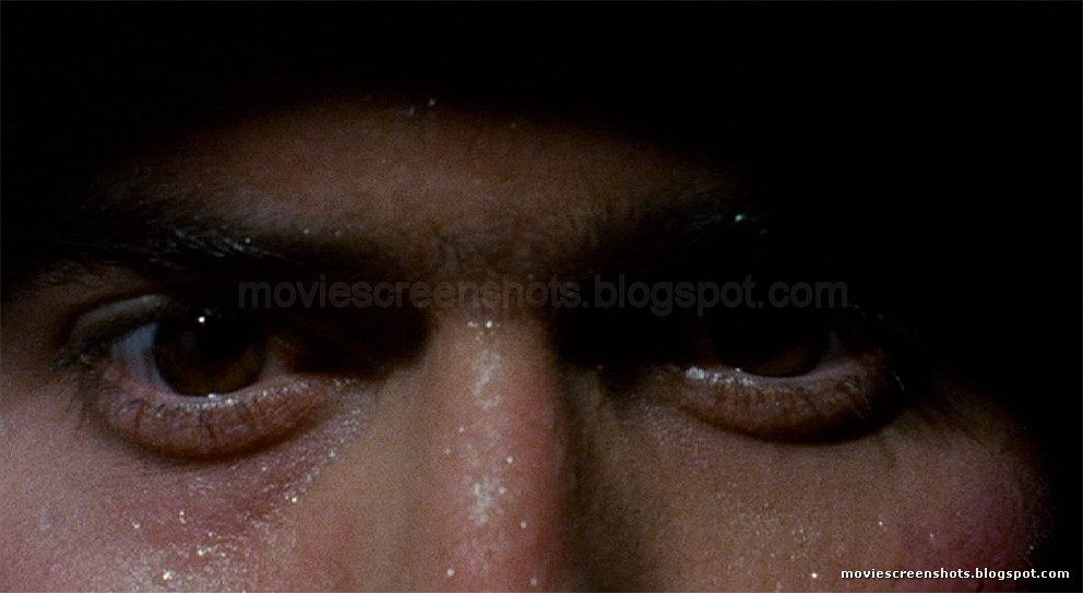 Sam Raimi may have very little money to work with in his early films but that never stopped him from innovating with the camerawork and editing and The Evil Dead, despite having a meager budget of somewhere around $350,000 to $500,000, is definitely no exception. Like I said earlier, this is where I feel the film is able to overcome the shortcomings I think it has and really shine. The often talked about traveling POV shot, where the camera feels like it's either floating just above the ground or screeching through the woods while gracefully swerving around obstacles, is so effective and memorable and yet, was so simple to pull off by putting the camera on a plank of wood and having two people on either side to carry it around that it really shows how inventive Raimi is with that kind of stuff. Equally impressive is the camerawork you see during the climax, where the camera is either upside down, tilted at an angle and staying where it is while still panning with Ash as he runs by it, creating a rather odd visual, behind a swinging clock pendulum in a shot that frames Ash's face, rushing towards his face to frame it at an angle, or panning past some ceiling rafters with Ash as he walks in the room down below (complete with an inexplicable, "Wha, wha-wha," sound whenever it passes over a beam). Another good shot is the titled angle of the shadow of Scotty's hand creeping across a curtain, preparing to yank it back, which I know Raimi himself has said is his favorite shot in the film and I can't blame him for feeling that way. I also really like some of the stuff he does with the editing, like the really quick cuts combined with the often sharp close-ups on things to create montage, such as when Scotty knocks Cheryl down into the basement and, as he chains up the hatch, you see quick shots of his hand looping the chain through the latches, ending on a close-up of Scotty as he sits down, with Cheryl gently pushing him up and down from below. Another such sequence that comes to mind is when Ash straps Linda to that cutting block in the shed and prepares to dismember her with the chainsaw, composed of a number of quick close-ups of his hands latching the hooks on the chains, hoisting the block into place, turning on the saw, and holding the blade right above her. And finally, you have that nice play on Ash and Linda's eyes during that warm scene between them, which is brought back in a more sinister way later on when Ash attempts to bury his now possessed girlfriend.