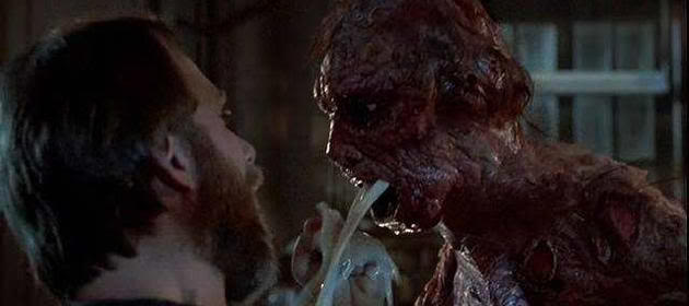 The dog is such a definitive example of what a horrible, uncaring person Bartok is that it makes his comeuppance at the end, when Martinfly teleports with him and the gene-swapping program reduces him to a misshapen creature while Martin becomes a normal human, all the more satisfying. There's no other way to describe the "Bartok Beast," as this creature is called by Chris Walas and his crew, other than a vaguely humanoid mass of mutated flesh that's unable to walk and whose only vocalizations are inhuman growls and howls. When Martin is reintegrated as a normal human, he's initially attached to the creature in a nasty sac of flesh and blood that Beth has to peel him out of. It's nasty, to say the least, and I always cringe when Beth actually hugs him right after she's ripped him loose. I think, "I know you're glad he's back but couldn't you have waited until he showered before that? Ugh!" And like I said before, not only is Bartok now a mutant monster but he's also treated as nothing more than a research specimen, kept in the same pen and forced to eat the same slop as the dog, which is just perfect payback. It has nice closing shot as well, where the creature notices a common fly on the rim of the dish, which I like to think is the filmmakers saying, "The little insect that started it all."