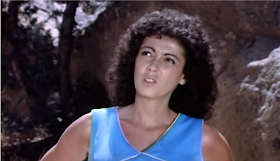 The lake where the spaceship crash-lands at the beginning of the movie was shot near the Hansen Dam in the San Fernando Valley, as was, I'm sure, the thick forests, bogs, and streams they cross through during their first day on the planet. When they get into the rocky, more desert type of landscape, we're into the Vasquez Rocks National Park, which has been used in numerous movies and television shows. Additionally, the canyon that features in the film was shot in Pasadena. Altogether, these locations do give off a sense of an ancient, primordial world, with the jagged rocks,occasional spots of shrubbery and streams, and the wide vistas of the landscape. This setting is very akin to those seen in past dinosaur movies like One Million Years B.C., The Valley of Gwangi, and When Dinosaurs Ruled the Earth. But, as effective and nice to look at as they are initially, they start to lose their luster as the movie goes on and you continue to see nothing but the small valley they take shelter in and the area around it. And there are way too many dialogue-less scenes of the characters just walking and walking and walking through the environment for minutes on end, giving off vibes of not only stuff like Gerry (okay, maybe not that extreme) but, on the more low rent end, movies like Robowar.